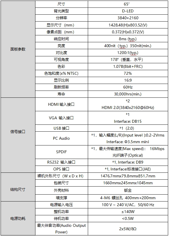 · 四等边设计,隐藏式红外接收,留有OPS接口,可选配插拔式OPS电脑,超强质感;