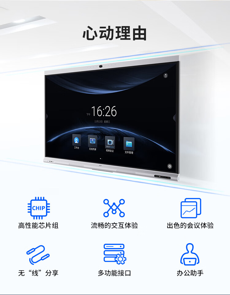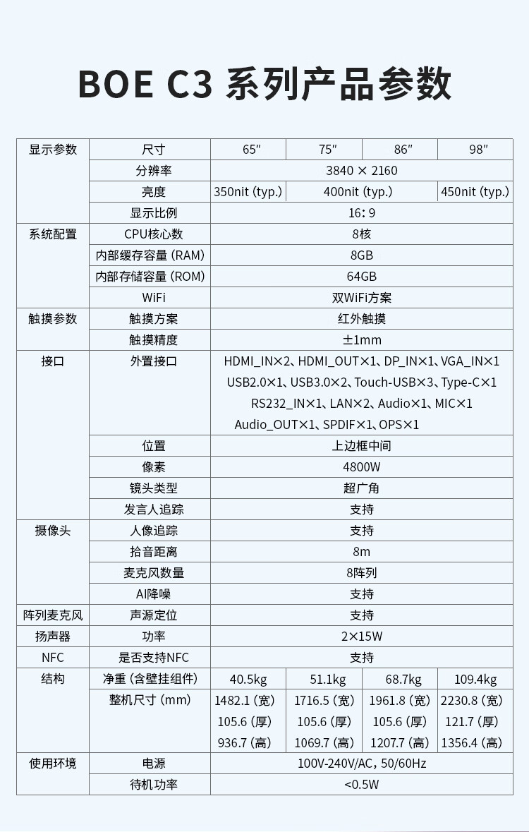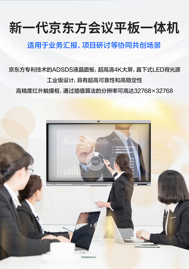 产品型号BWB65-GI4C3 65寸交互平板,采用京东方专利技术的ADSDS液晶面板,超高清3840*2160分辨率,低功耗,广视角。直下式LED背光源,显示亮度更均匀,色域更广。工业级设计,具有超高可靠性和高稳定性。触控技术采用高精度的红外触摸框,通过插值算法的分辨率可高达32768*32768。