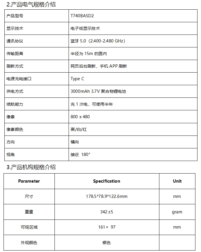 1) 品牌型号:BOE蓝牙电子桌牌,T740BTRD1(红木色),T740BTSD1(银色),