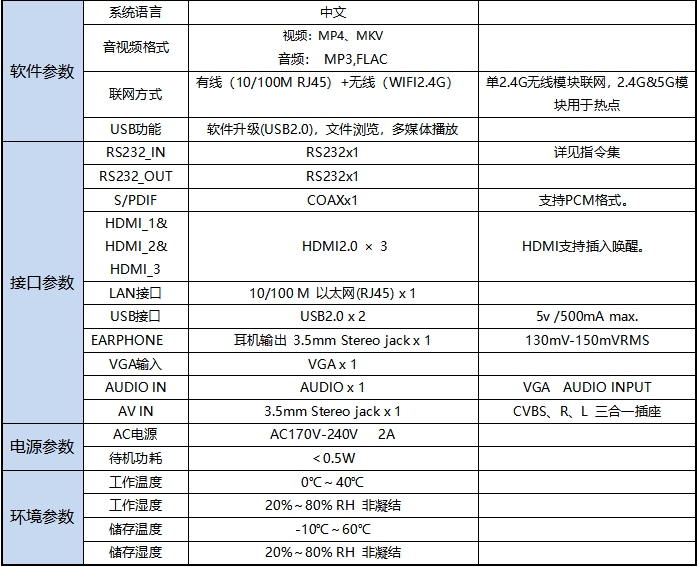 · 支持开机通道选择、开机上电是否自启选择,视频信号插入唤醒、支持HDMI插入开机、定时开关机、视频信号自动检测切换等商务场景下的功能。